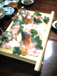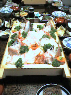 さあ、宴会です。今回は、イセエビコースとアワビコースを各自の好みに合わせて お願いしておきました。イセエビコースは、イセエビの刺身一匹分がつき、翌朝の 味噌汁に頭が入っています。アワビコースは、活きアワビのバター焼きになります。 料理の詳細については、写真を参考にしてください。 もう、それはおいしゅうございました。私はアワビコースを頼んだのですが、アワビを 食べ終わった後バター風味の出汁が残っていたので、そこにご飯を入れて残った 燃料で暖めてアワビ雑炊もどきを作って食べましたが、これもまた、とても おいしゅうございました。刺身盛もそれはそれは豪華かつ美味なものでした。